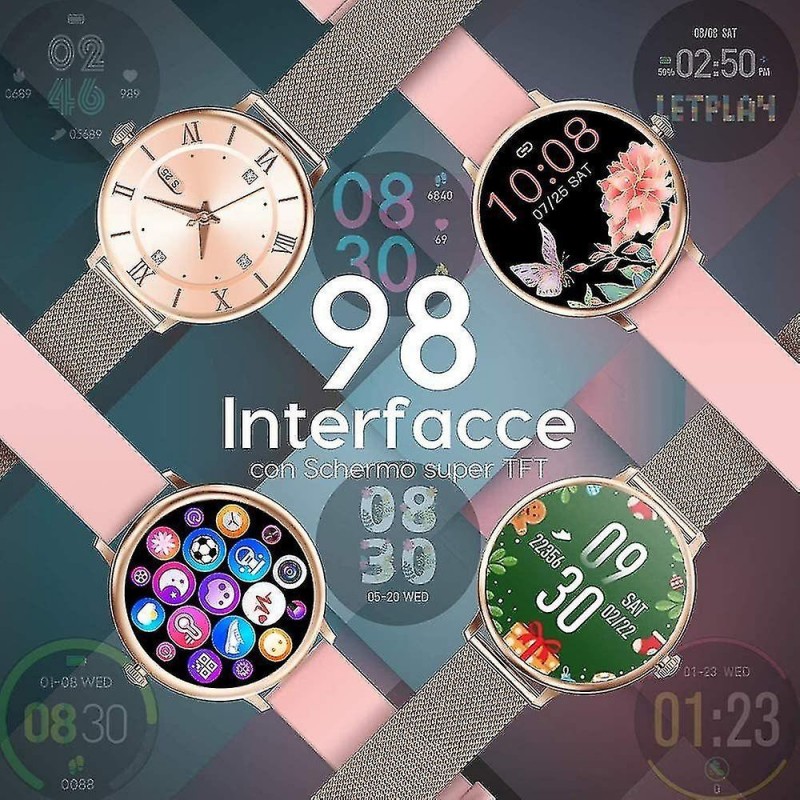 Orologio intelligente impermeabile con schermo touch completo L'aspetto elegante di questo orologio intelligente con schermo touch completo è il regalo migliore per le donne, misura la frequenza cardiaca, la pressione sanguigna, il monitoraggio del sonno, il ciclo fisiologico femminile, contapassi, chilometri sportivi, consumo calorico, fotografia a distanza, promemoria sedentari, molte modalità sportive, ecc. Impermeabile, antisudore e antipioggia nella vita quotidiana. 8 modalità sportive e impermeabilità IP67 Tieni traccia delle attività di tutto il giorno, inclusi passi, distanza e calorie bruciate. 8 modalità sportive monitorano i tuoi dati di movimento per personalizzare il tuo allenamento. Corsa, ciclismo, calcio, ecc. Puoi monitorare le tue bracciate in piscina e usarle sotto la doccia fredda. Notifiche e SMS Ricevi chiamate, SMS e messaggi SNS, Facebook, WhatsApp, Twitter, Instagram, ecc. Quando ricevi una notifica, l'orologio vibrerà per ricordartelo. Basta collegare il braccialetto al telefono tramite l'app e impostarlo nell'app. Nessuna chiamata o messaggio andrà perso. Cardiofrequenzimetro e monitoraggio del sonno Con sensori ottici intelligenti integrati, l'activity tracker monitora la frequenza cardiaca in tempo reale e rileva automaticamente la frequenza cardiaca. Inoltre, monitora efficacemente la qualità del tuo sonno e fornisce un'analisi completa della qualità del sonno per aiutarti a sviluppare uno stile di vita più sano. Compatibilità e altre caratteristiche: questo orologio è compatibile con smartphone con iOS 9.0 / Android 4.4 o versioni successive e Bluetooth 4.0 o versioni successive. Questo orologio offre anche sveglia, cronometro, controllo remoto della fotocamera, previsioni del tempo e regolazione della luminosità. (Non compatibile con iPad)